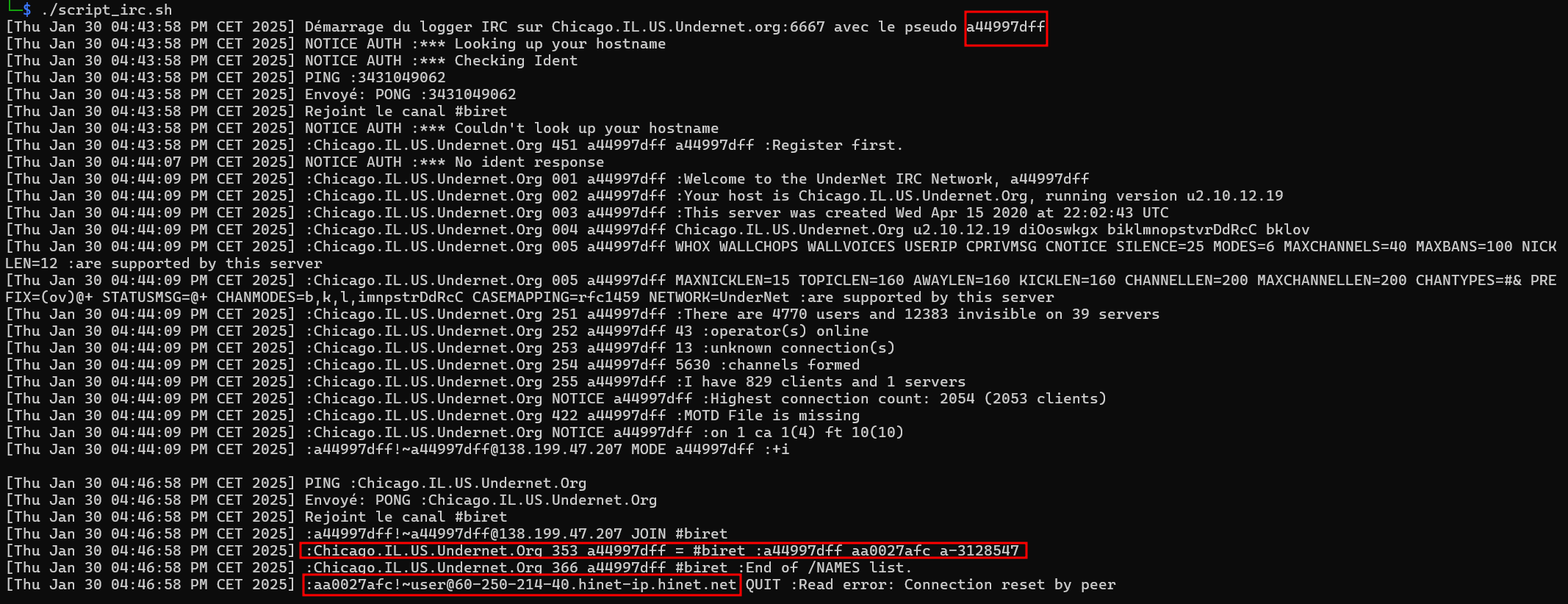 echo "[$(date)] Starting IRC logger on $SERVER:$PORT with nickname $NICK" | tee "$LOG_FILE"