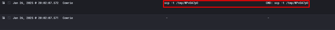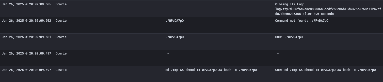 Finally, the attacker tries to execute the script via the command cd /tmp && chmod +x WPvDA7pO && bash -c ./WPvDA7pO. However, the execution fails because Cowrie has already removed the file and collected the sample.